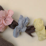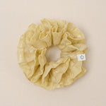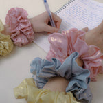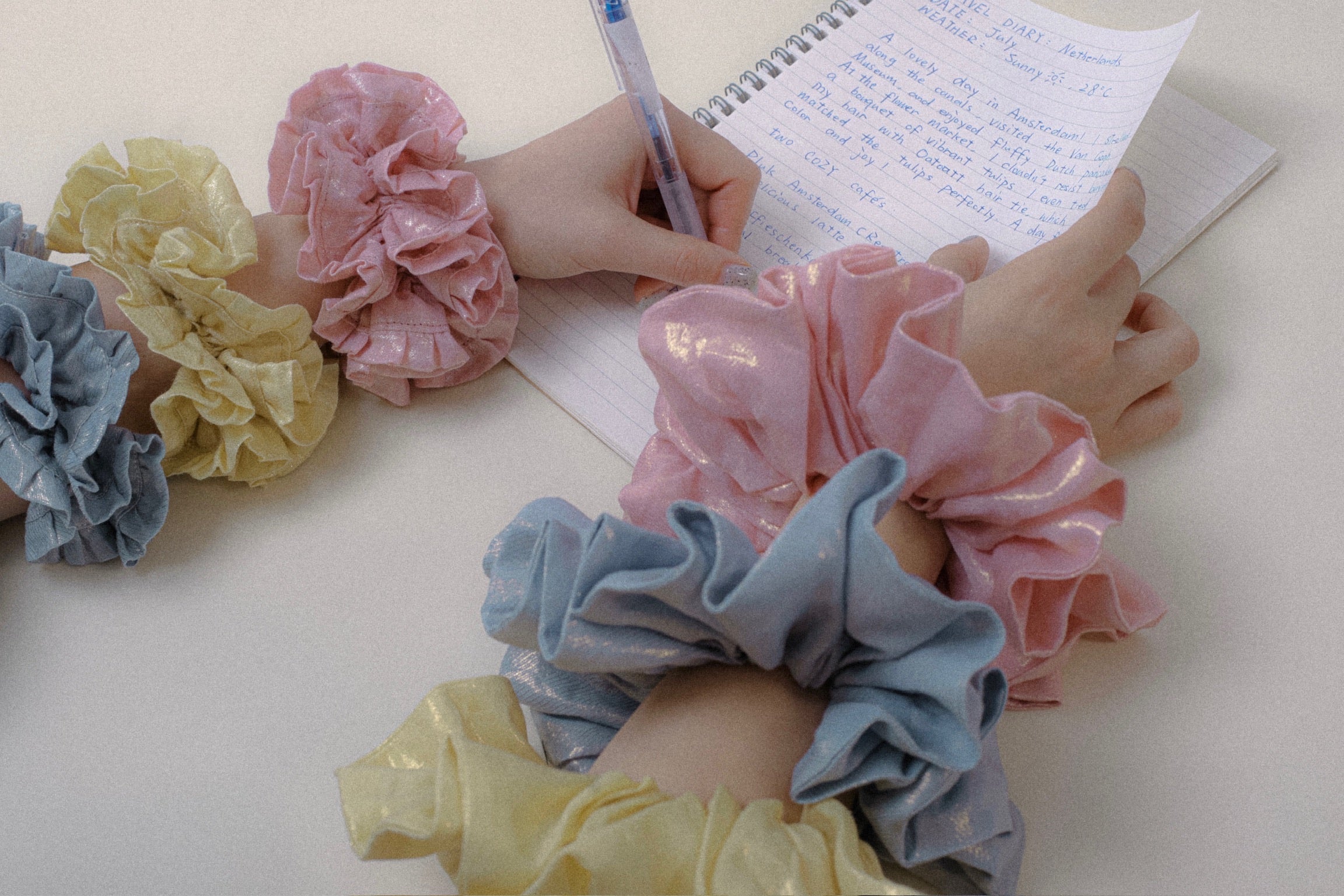 The Dutch Puffs collection is inspired by the classic Dutch treat, cream puffs, bringing a sweet and lighthearted vibe. Featuring dreamy shades of pink, yellow, and blue, along with a linen texture and gold foil details, these hair ties are lightweight and soft.